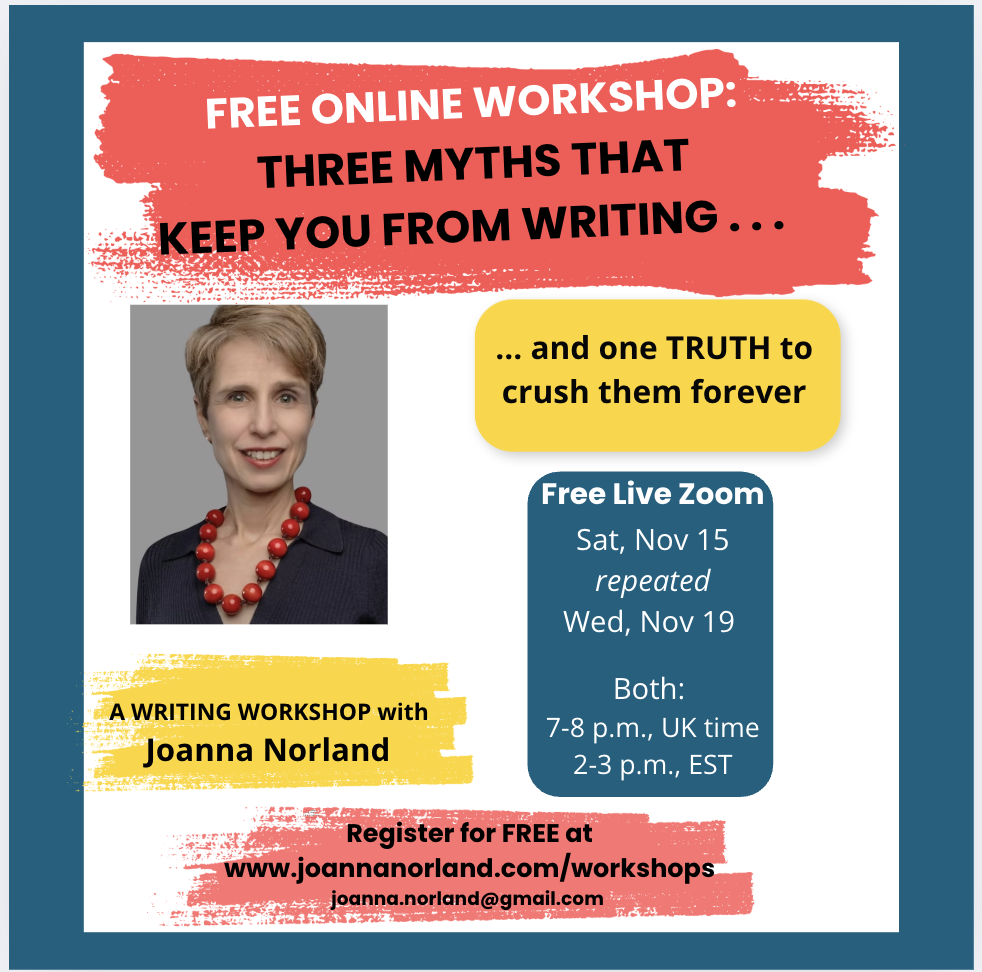 Writing coach Joanna Norland offers a free workshop to help you to realise your ambition to be a writer and dispels the three writing myths that keep you from writing. The free zoom workshop is on Saturday 15th November 7-8pm, repeated the same time on Wednesday 19th November. Register using the link here https://www.joannanorland.com/post/three-myths-that-keep-you-from-writing or use the URL on the poster. Good luck!